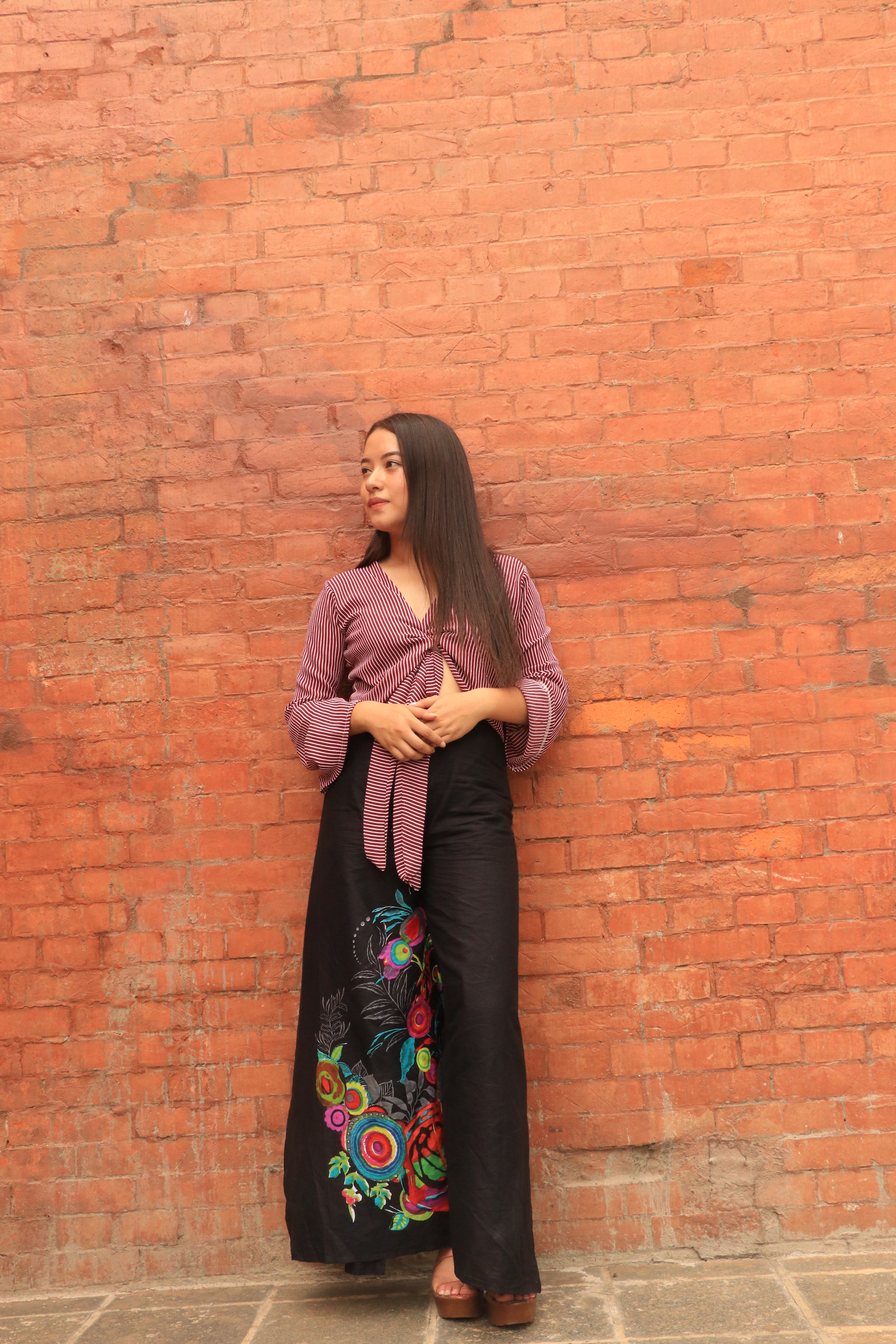 Wrap pant is basically just a piece of plain clothing when you initially look at it. Tying the four laces each at the fabric’s end , you can now style it at your convenience. I chose myself a tribal print in carbon black color.