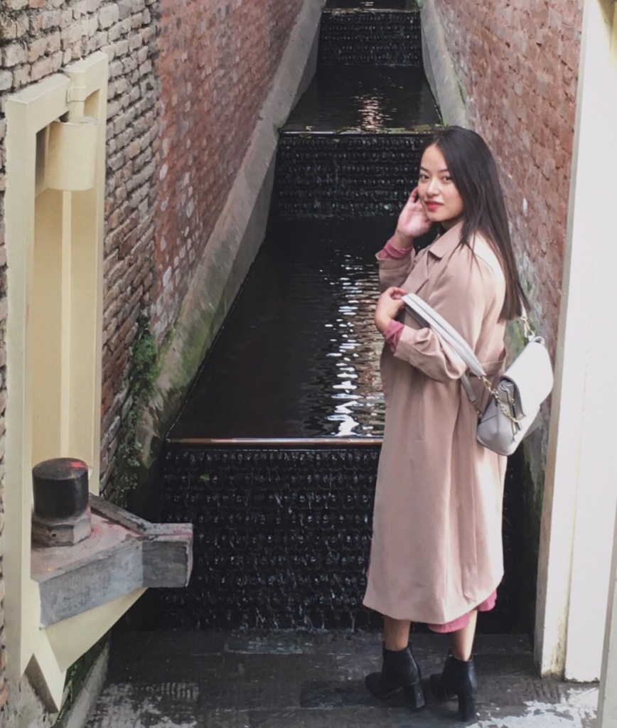 Clothes: A black high neck mesh top/ A peach colored woolen dress/ A cream colored overcoat