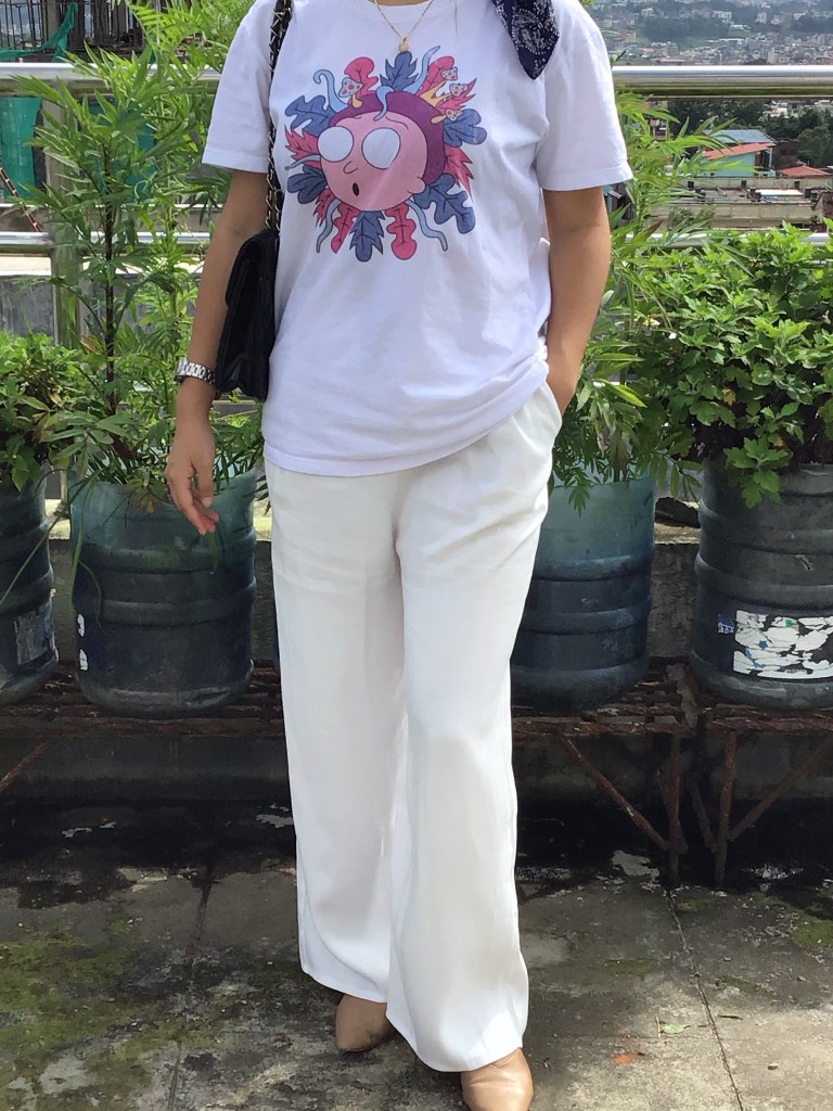 Here, I decided to let the T-shirt be as long as it is and paired it up with white trousers/pants. I picked a nude color close-toed shoes and made them work together which is personally my favorite outfit styling of the Graphic T. You can wear this to any formal event, lunch date, or even to your office. It has an intrusion of both fun playful mood and elegant vibes.